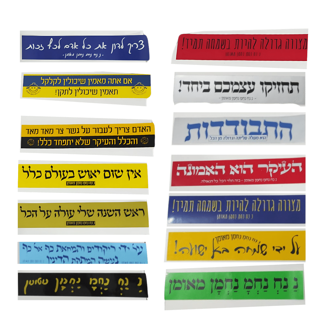 חבילת 14 מדבקות מעוצבות עם משפטים מעוררי השראה מספרי ברסלב, בגודל 5*25 ס"מ, לעידוד וחיזוק יומיומי. המדבקות עשויות מחומרים איכותיים, מעוצבות בגופן קריא וצבעים הרמוניים, ומתאימות להדבקה על משטחים שונים. (צבעי המדבקות המוצגים בתמונה הינם להמחשה בלבד. כל חבילה מכילה מבחר אקראי של צבעים, וייתכן שתקבלו שילוב שונה מזה המוצג).