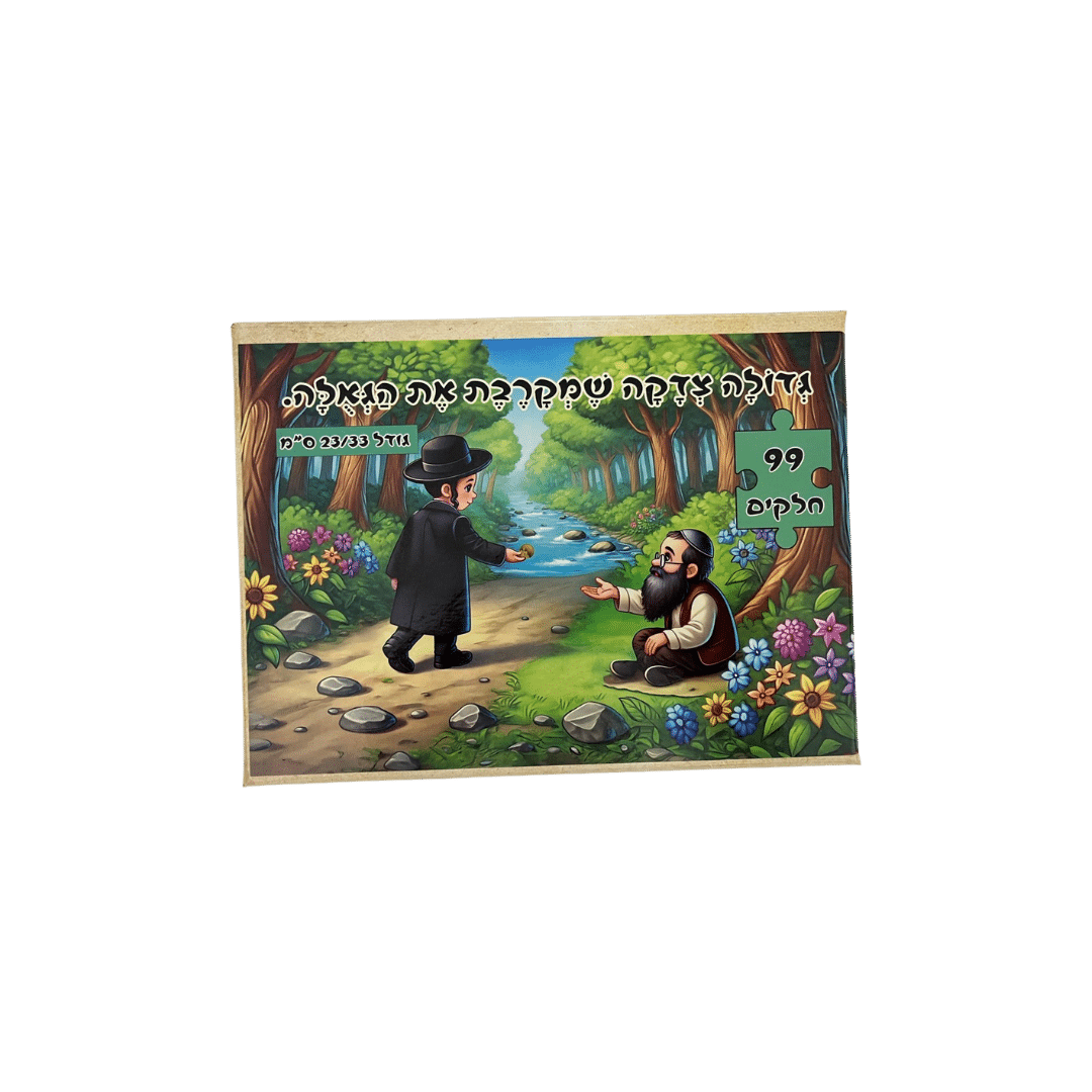 פאזל "גדולה צדקה שמקרבת את הגאולה" הוא פאזל מאתגר בן 99 חלקים, הממחיש את הרעיון היהודי שכוחה של הנתינה מקרב את תיקון העולם. הרכבת התמונה המרגשת, בה ילד מעניק צדקה, היא משל לאופן שבו מעשי חסד קטנים מצטרפים יחד ליצירת מציאות טובה יותר. הפאזל המוגמר הוא יצירת אמנות מחממת לב, המשמשת תזכורת יומיומית לחשיבות החסד וכלי חינוכי רב עוצמה.
